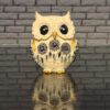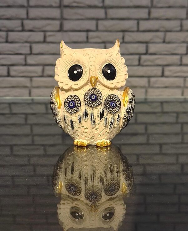 This owl statue features a unique combination of a cute owl figurine adorned with three mesmerizing evil eyes.